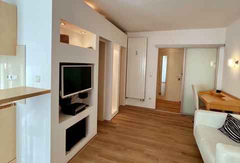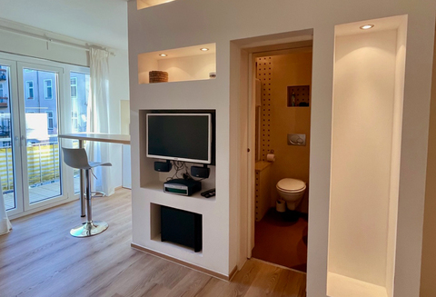 Möblierte Wohnung Sicht auf Küche weiß mit Holz Möblierte Wohnung mit Sicht auf Eingangsbereich Möblierte Wohnung Sicht auf Wohnraum und Badezimmer Möblierte Wohnung mit Sicht auf Wohnzimmer und Fenster Möbliertes Studio Innenbereich Möbliertes Studio Blick auf TV und Badezimmer Möbliertes Studio Küchenzeile mit Theke Möbliertes Studio mit Schlafbereich und Sofa Badezimmer weiß in möblierter Wohnung
